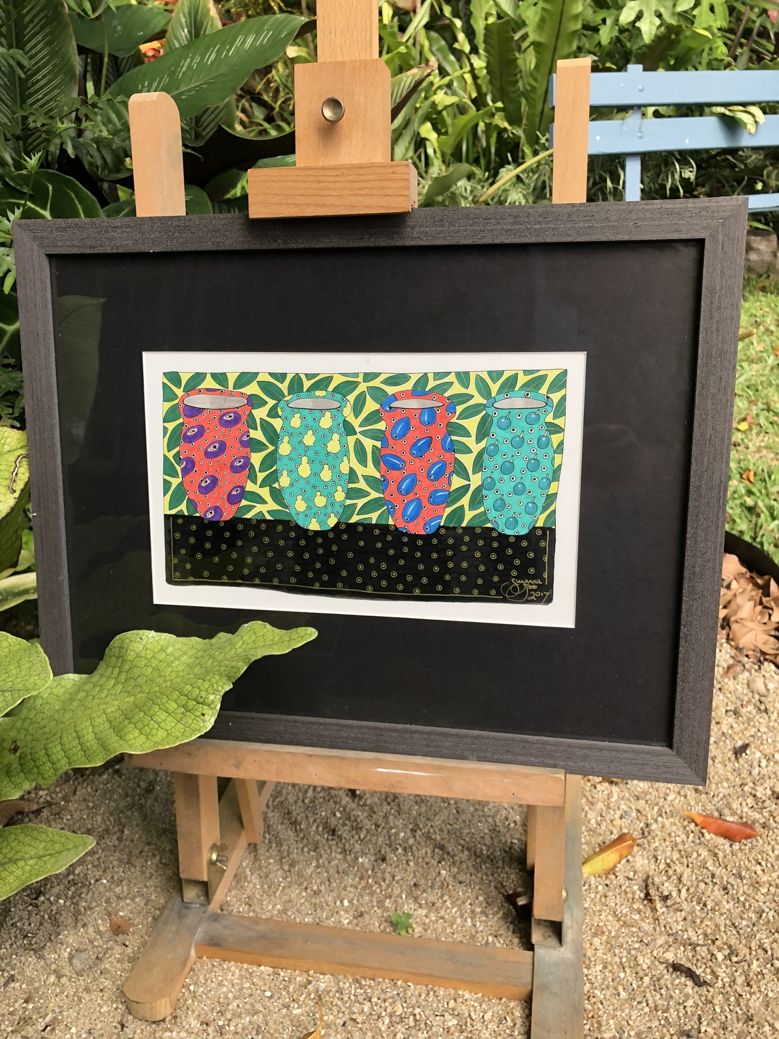 Four Rainforest Fruit Vases A Ink on Paper Framed original drawing Framed size 350×455mm