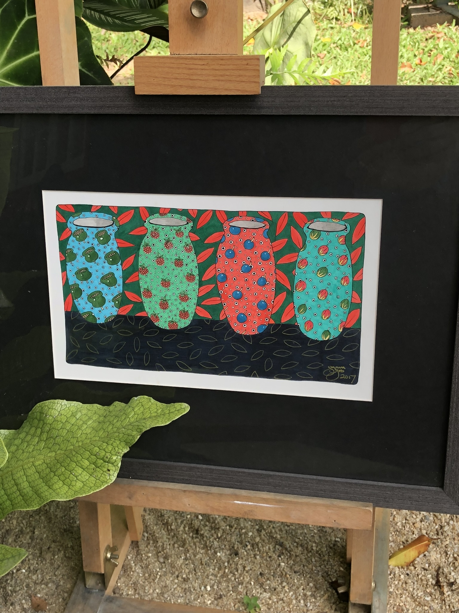 Four Rainforest Fruit Vases B Ink on Paper Framed original drawing Framed size 350×455mm