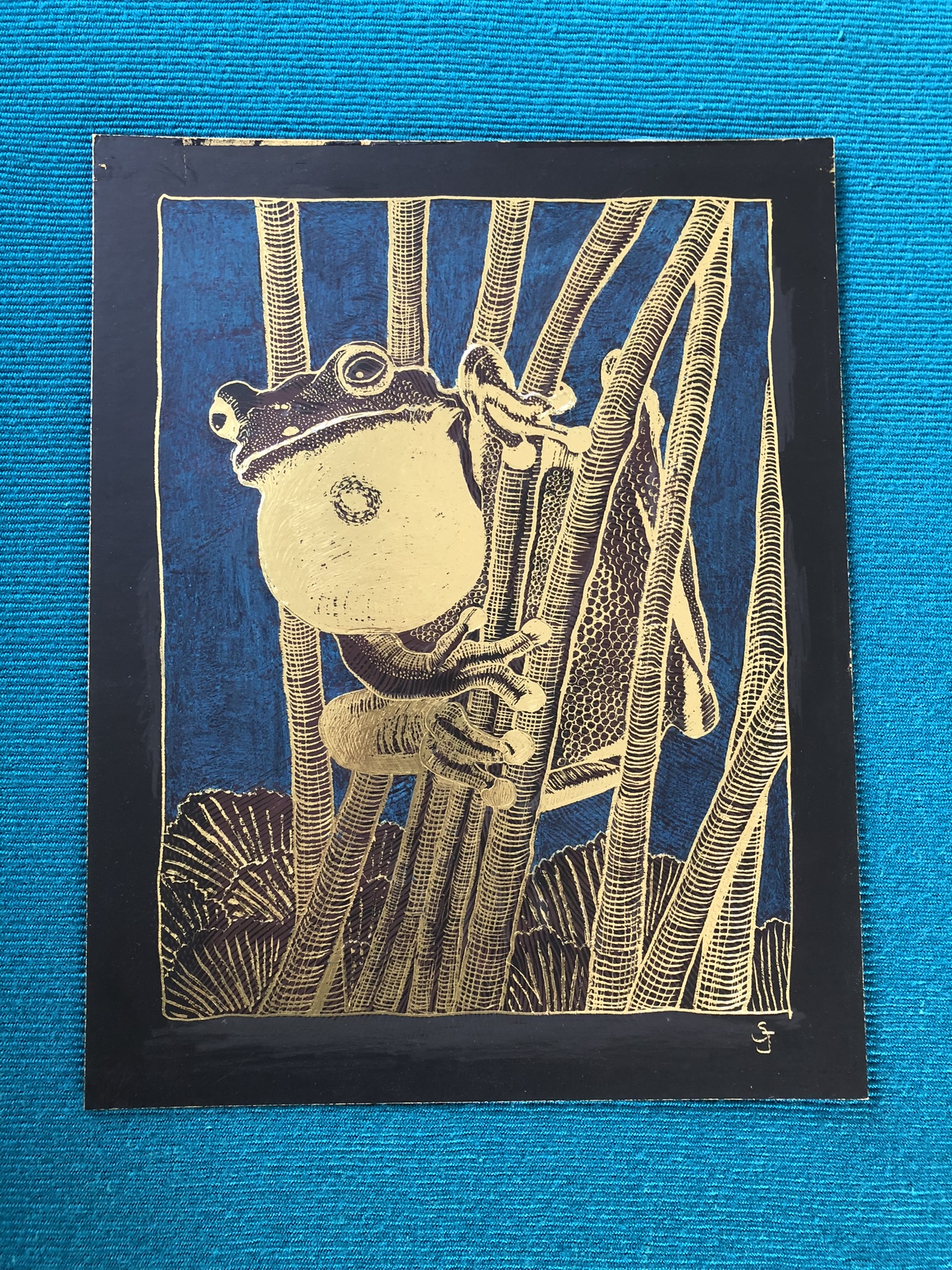 Frog Etched onto Gold Scratchboard Unframed original Unframed size 200×250mm